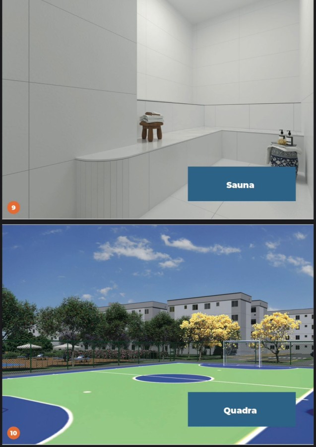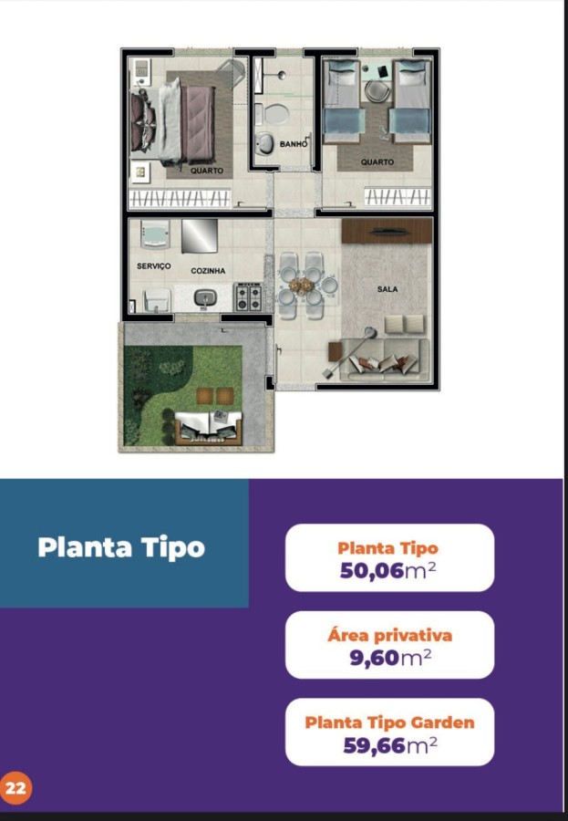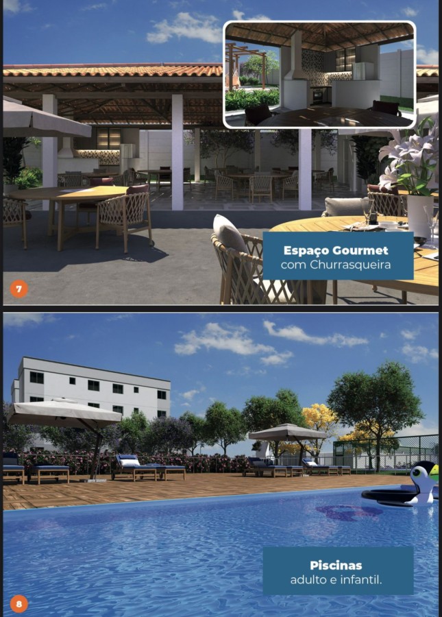 As plantas dos apartamentos variam de 50,06m2 até 62,74m2, com uma composição perfeita de sala, cozinha, 02 dormitórios e banheiro. Além disso, o condomínio oferece uma infraestrutura completa, com piscina, área de lazer, área de churrasco, sauna a vapor, espaço jogos, espaço saúde, bicicletário, redário, playgroud, espaço mulher, e muito mais.