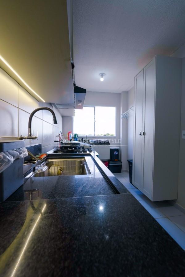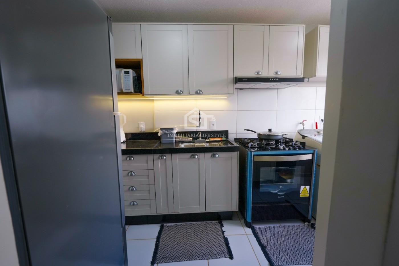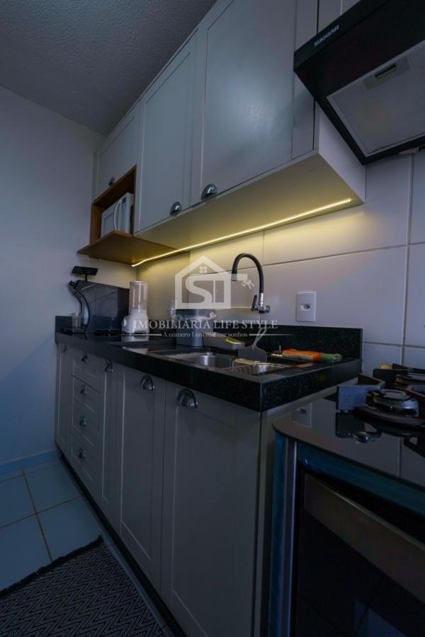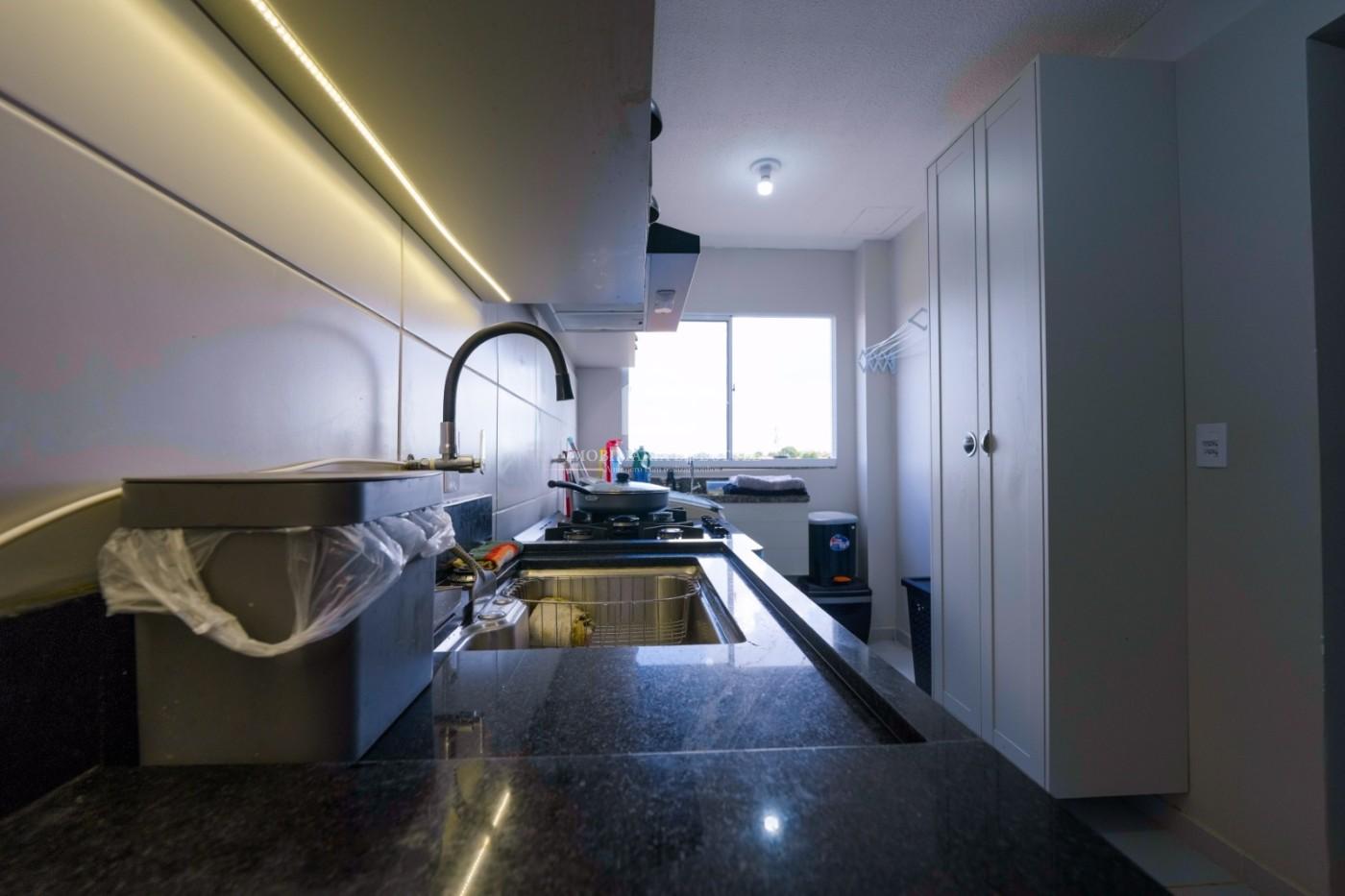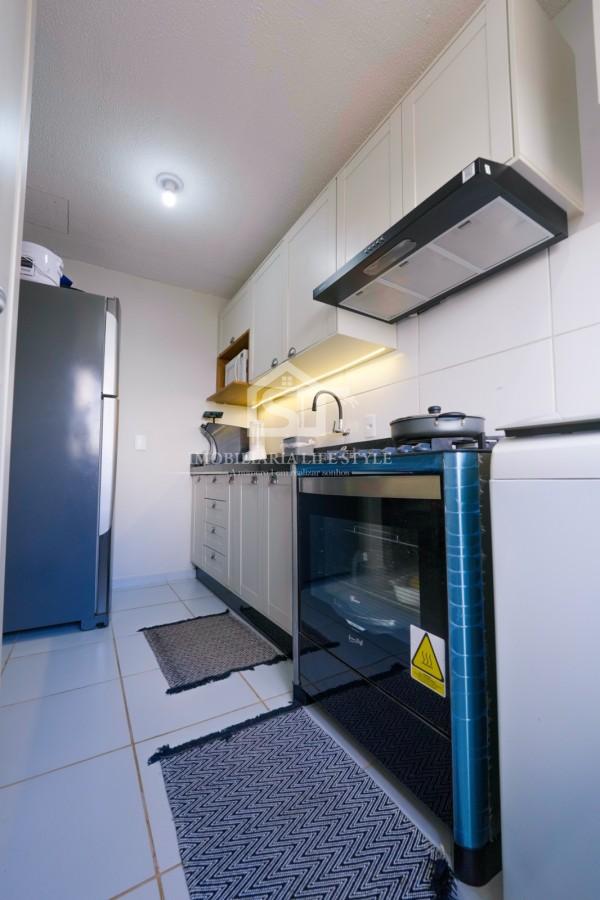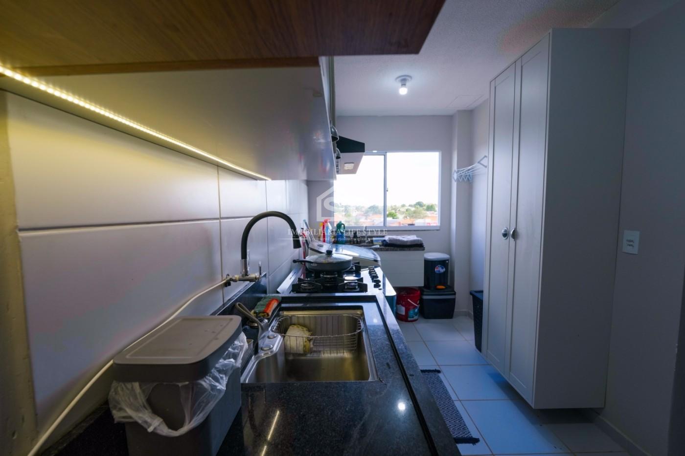 A cozinha é totalmente planejada, com armários na parte superior e inferior da pia, oferecendo excelente aproveitamento de espaço e organização.